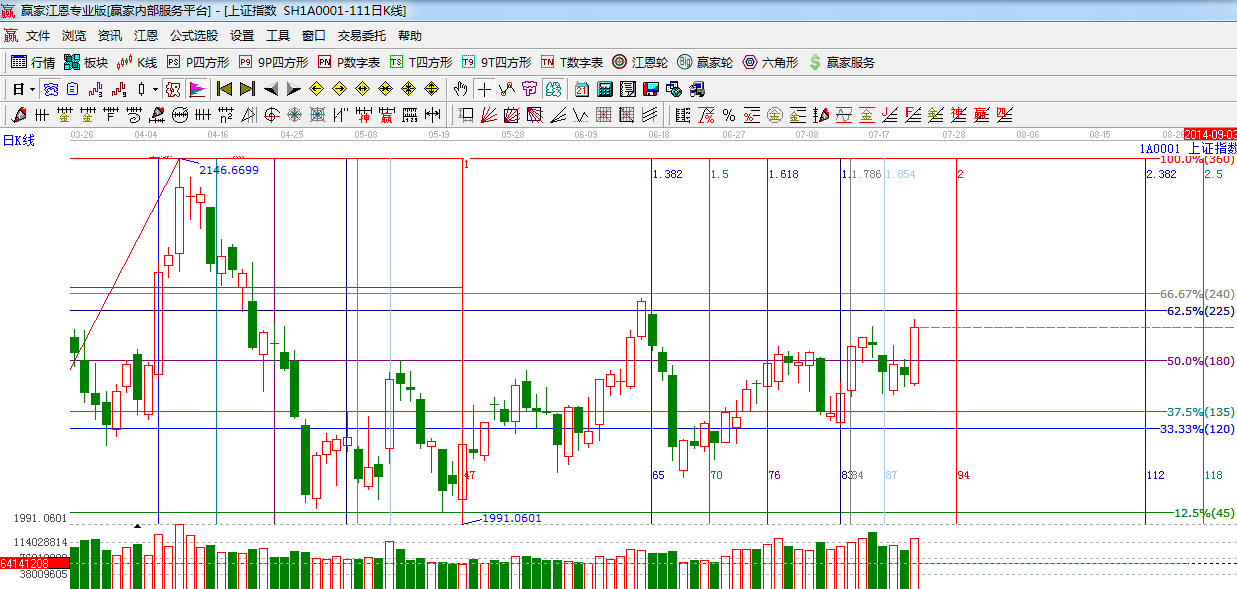 江恩看盤綜述:依據(jù)贏家江恩技術(shù)工具分析得出:周二指數(shù)低開高走,放量突破2060點阻力,指數(shù)下一目標(biāo)位是2082-2089區(qū)間,是預(yù)計短期指數(shù)以高位震蕩為主,日線下一時間窗口是7月28日。操作上,繼續(xù)關(guān)注低位藍(lán)籌股以及受益微刺激的高鐵、核電、特高壓、新能源等概念。