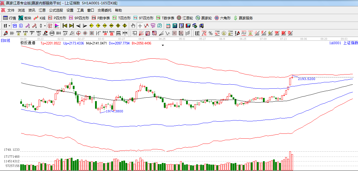 盤面上,個股板塊漲多跌少,航天軍工,國產(chǎn)軟件,鋰電池,倉儲物流等板塊表現(xiàn)活躍,藍(lán)籌股出現(xiàn)分化,鋼鐵、有色、煤炭等出現(xiàn)不同程度的回調(diào),只有房地產(chǎn)和券商板塊上漲,今日題材股表現(xiàn)好于權(quán)重股,指數(shù)上攻動能在衰減,而且指數(shù)也逼近極反通道紅色外軌阻力線附近,預(yù)計(jì)短期大盤將沖高回落。