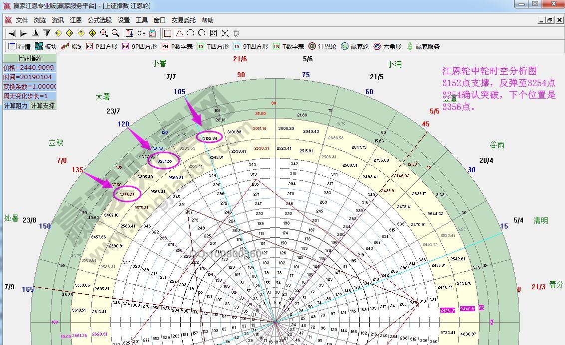 ☆依據(jù)贏家江恩理論系輪中輪提示:以2440點(diǎn)為起點(diǎn)做江恩輪中輪時(shí)空循環(huán)圖,大盤收盤站在三角形120度3254點(diǎn)下方,19號(hào)早盤關(guān)注此位置得失,向上循環(huán)是3305點(diǎn),向下循環(huán)是3203點(diǎn),上下選擇以120度3254點(diǎn)做決策,今日收盤在3254點(diǎn)下按規(guī)則看空。