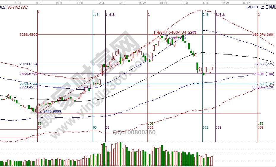 大盤自5月第一個(gè)江恩時(shí)間窗口8號(hào)、9號(hào),與江恩價(jià)格形成時(shí)價(jià)四方信號(hào),按預(yù)判短線反彈已展開一周,同樣參與者也收到利潤回報(bào)。通過贏家江恩分析體系判斷,短線動(dòng)作還能延續(xù),隨著時(shí)間5月第二個(gè)時(shí)間窗口17號(hào)臨近,需要關(guān)注波段百分比延伸線2倍零度位2966點(diǎn)反壓力,此線附近會(huì)有反復(fù),獲利豐厚者可以選擇高拋部分籌碼,待確認(rèn)反彈延續(xù)性后再度參與。首次關(guān)注贏家江恩的學(xué)員可查看歷史,4月22號(hào)盤后大勢(shì)分析提醒倉位降至3成,4月25號(hào)低風(fēng)險(xiǎn)者可以空倉休息,5月8號(hào)開始再度進(jìn)場(chǎng),規(guī)避風(fēng)險(xiǎn)參與反彈,皆是通過贏家江恩體投資系判斷。16號(hào)盤中支撐是135度2911點(diǎn),盤中壓力270度2961點(diǎn),本周五17號(hào)是5月第二個(gè)時(shí)間窗口。操作策略,指數(shù)擊破黑色生命線進(jìn)入弱勢(shì)區(qū)域,目前處于短線反彈周期,高風(fēng)險(xiǎn)者倉位3-4成,低風(fēng)險(xiǎn)者等待中期參考位。