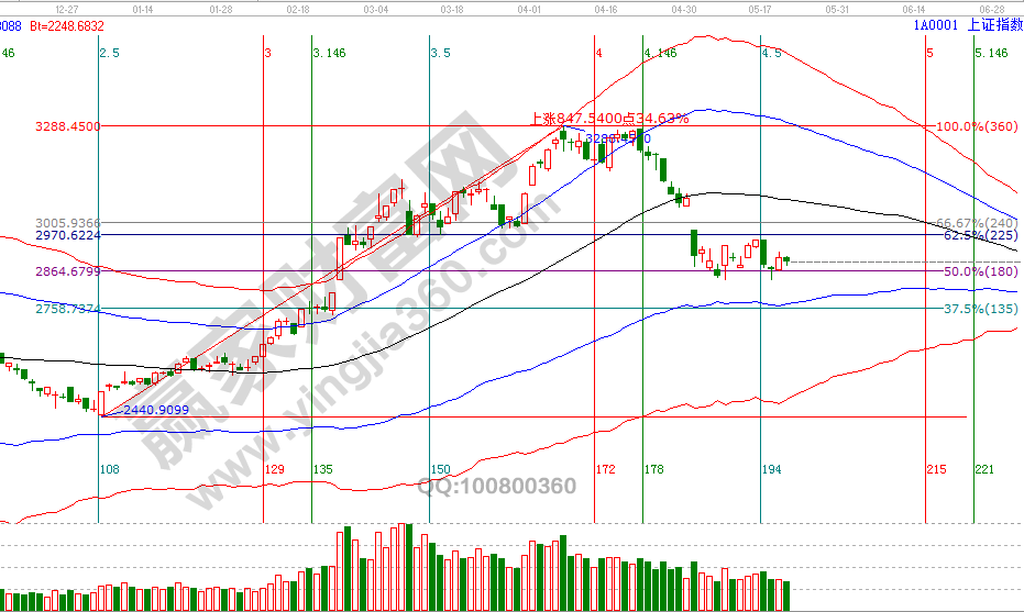 23號(hào)是贏家江恩系統(tǒng)江恩時(shí)間短周期窗口,同時(shí)明天將確認(rèn)空間價(jià)格上一關(guān)鍵位,具體VIP學(xué)員可以通過(guò)極反通道查看60分鐘生命線。此線的重要性22號(hào)分析中已談到,得失影響著市場(chǎng)是否回探藍(lán)色下軌線及橫盤(pán)整理的時(shí)間。高風(fēng)險(xiǎn)者在2840附近參與的籌碼,要有足夠的耐心和充分的風(fēng)險(xiǎn)控制能力,日線藍(lán)色下軌線是底線,待整固結(jié)束后市場(chǎng)必會(huì)有一波反彈到生命線的機(jī)會(huì)。5月最后一個(gè)日線時(shí)間窗口是28(29)號(hào)。23號(hào)盤(pán)中壓力是180度2928點(diǎn)、225度2944點(diǎn),盤(pán)中支撐是0度2860、45度2877點(diǎn)。操作策略,指數(shù)擊破黑色生命線進(jìn)入弱勢(shì)區(qū)域,高風(fēng)險(xiǎn)者倉(cāng)3-4成,低風(fēng)險(xiǎn)者本周進(jìn)入備戰(zhàn)期擇機(jī)參與。