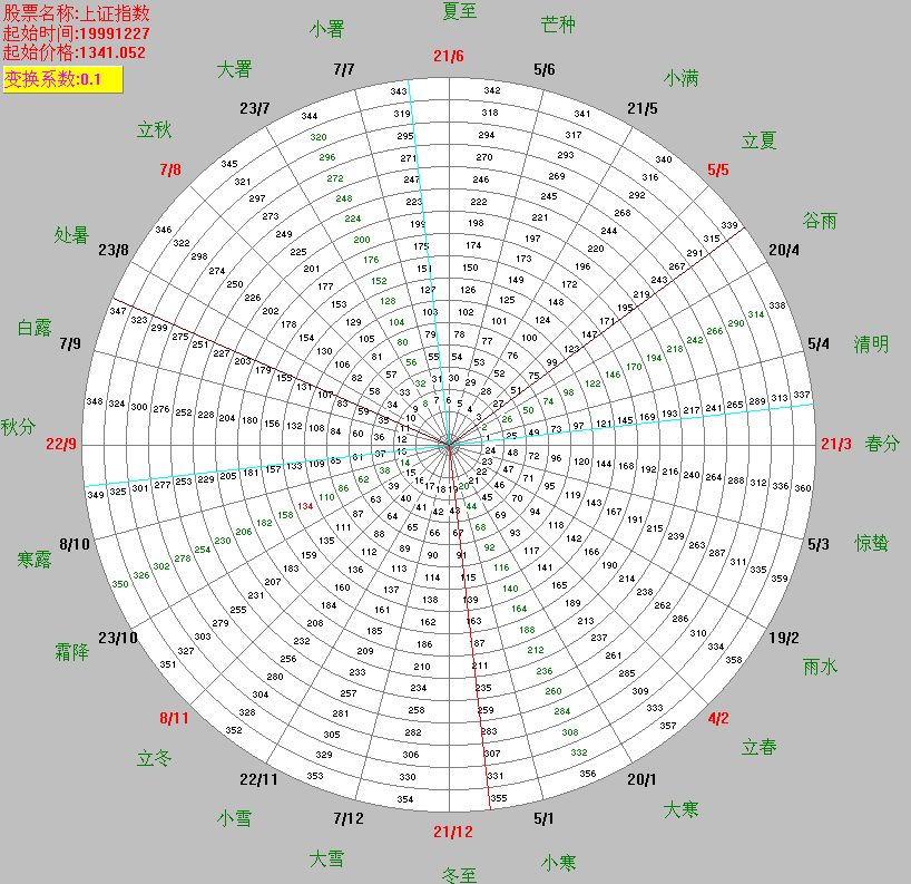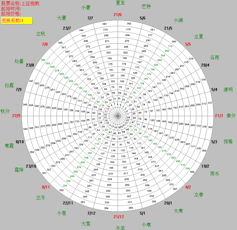 如果股價(jià)或指數(shù)較大或較小不能在360數(shù)的輪中輪顯示,則可以選擇適當(dāng)?shù)淖儞Q系數(shù),將股價(jià)或指數(shù)進(jìn)行變換使其對應(yīng)輪上的一個(gè)數(shù)字,這個(gè)數(shù)字是用紅色表示的。