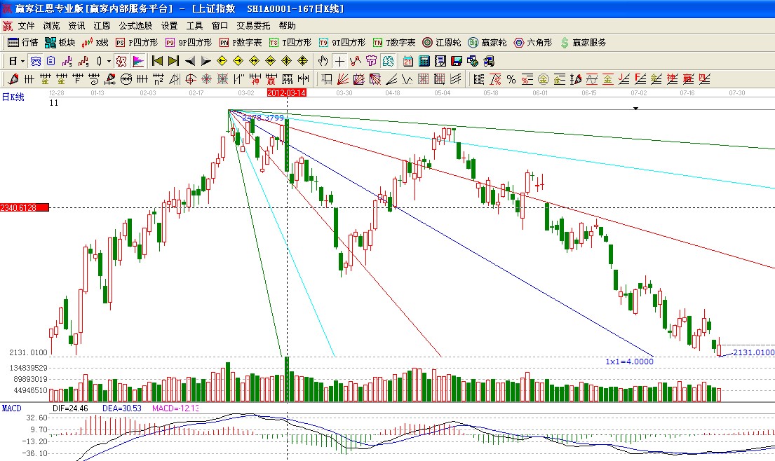 咨詢:13333833889上節(jié)我們簡單講解贏家江恩角度線畫法及公式,本節(jié)內(nèi)容主要介紹贏家江恩角度線用法,明白了角度線的制作原理,通過鼠標單擊指標可將角度線快速的畫出,線與線之間的關系我們進一步講解;