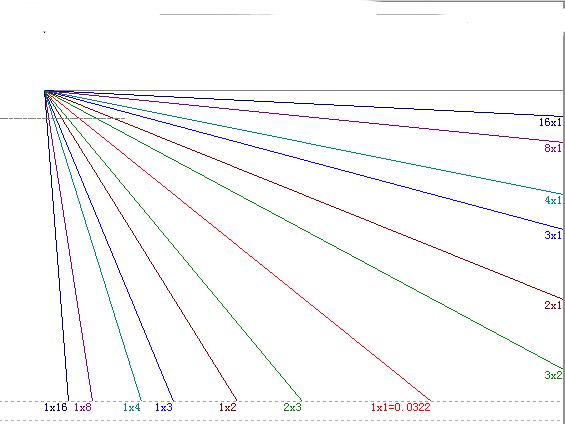 甘氏線的基本比例是1:1,也就是經(jīng)常說(shuō)的1*1線。表示單位時(shí)間內(nèi)運(yùn)行了一個(gè)價(jià)格單位。此外,甘氏線還有1*8、1*4、1*3、2*3等比例,每一條甘氏線都構(gòu)成對(duì)應(yīng)的幾何角度。如下圖: