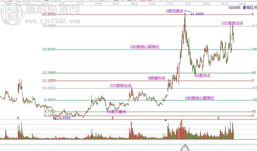 圖形解析:康拓紅外,階段低點5.59,以此價格為起點,作出K線價格四方形,同時,步長設(shè)定為起點5.59的0.1倍,即0.559;結(jié)合市場具體的走勢,保留關(guān)鍵的0度,45度,180度及315度。我們可以看到在不同的循環(huán)中,45度的兩波啟動,同時180度的震蕩走勢,以及315度的關(guān)鍵賣出點,以及最重要的0度循環(huán)位的頂點。
