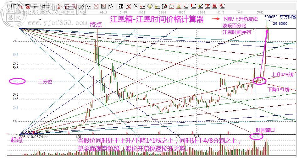 圖形解析:東方財(cái)富,以2012年12月7日低點(diǎn)和2015年6月5日高點(diǎn)為起始波段,時(shí)間周期為121周,根據(jù)市場(chǎng)具體的走勢(shì),步長(zhǎng)設(shè)定為121*6=726周,得出如上的分析圖??梢钥吹绞袌?chǎng)價(jià)格在周期內(nèi)的波動(dòng)情況,其中最關(guān)鍵的角度線(xiàn)的1*1線(xiàn)都是重要的阻力和支撐點(diǎn),以及價(jià)格的4/8分割位,而當(dāng)股價(jià)同時(shí)站上了兩條角度線(xiàn)的1*1線(xiàn)和價(jià)格的4/8分割位,就意味著市場(chǎng)趨勢(shì)非常強(qiáng)勢(shì)。因而,當(dāng)股價(jià)突破了這幾個(gè)關(guān)鍵的位置后,4/8分割時(shí)間序列窗口開(kāi)啟主升。