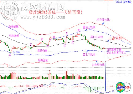贏家江恩軟件中有系列的趨勢工具,幫助投資者快速地研判市場的趨勢強弱及方向。其中最為經(jīng)典的莫過于極反通道。極反通道用5條線將股價分為4個通道(如下圖),中間的黑色生命線是絕對的中軌。股價在生命線上——強勢可操作;股價在生命線下——弱勢不操作,5條線互為阻力支撐線,一線站穩(wěn)趨勢看漲一線;一線未突破趨勢看跌回調(diào)一線。同時,極反通道提前演繹未來30天的通道走勢,可以直觀清晰的看到未來的趨勢方向及漲跌空間,是普通散戶進行股票投資必不可少的好工具。
