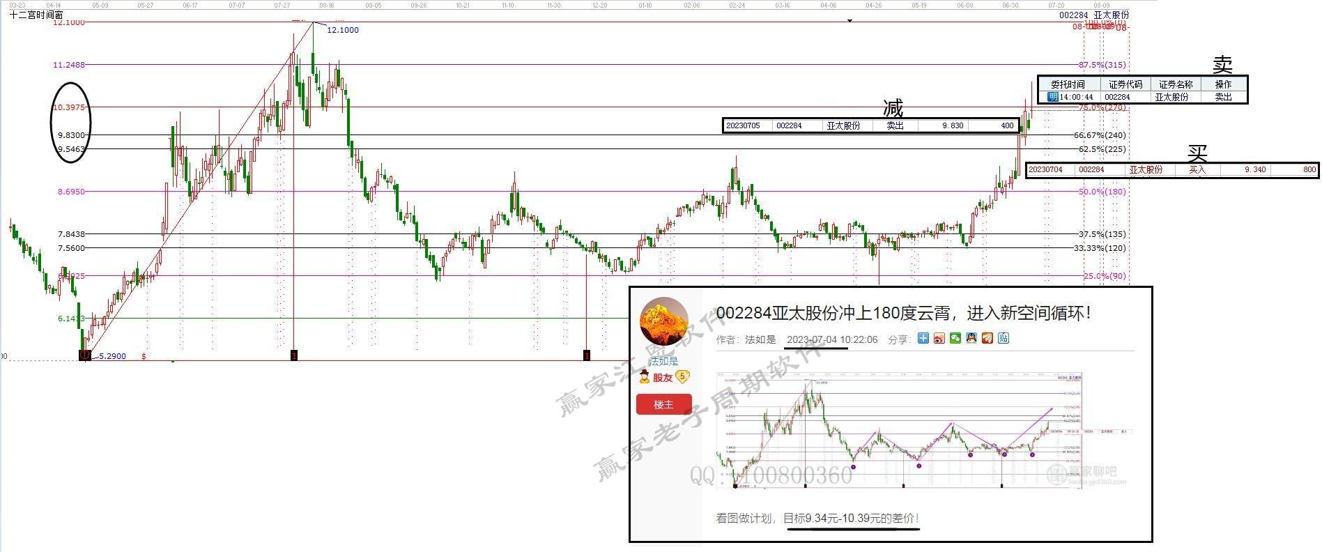案例二:亞太股份,按照江恩空間技術(shù)規(guī)則(報(bào)名成為學(xué)員系統(tǒng)教學(xué)),底部確認(rèn)空間上的支撐,目標(biāo)看上漲阻力位,預(yù)期看多價(jià)格9.54-10.39元,,對(duì)應(yīng)江恩角度位置225度(62.5%=5/8)-270度(75%=6/8)。后續(xù)市場(chǎng)驗(yàn)證抵達(dá)。買點(diǎn)和賣點(diǎn)的預(yù)期完全按照計(jì)劃執(zhí)行。江恩獨(dú)有空間把握起著預(yù)判趨勢(shì)以及買賣點(diǎn)位的作用,獲利利潤(rùn)落袋兌現(xiàn)空間財(cái)富。