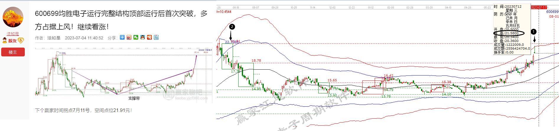案例三:均勝電子,運(yùn)用江恩量化工具贏家十二宮自動(dòng)呈現(xiàn)未來(lái)時(shí)空信號(hào),預(yù)期上方空間短期上漲目標(biāo)21.91元,至?xí)r間拐點(diǎn)11號(hào)。后續(xù)市場(chǎng)驗(yàn)收信號(hào)觸及21.58元至12號(hào)。相差1天的時(shí)間價(jià)格僅差0.33點(diǎn)。