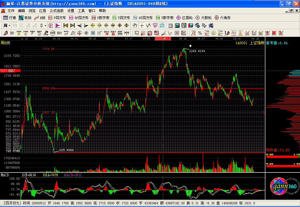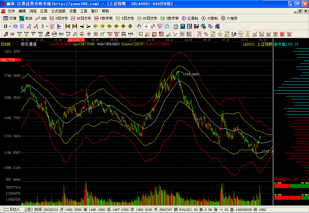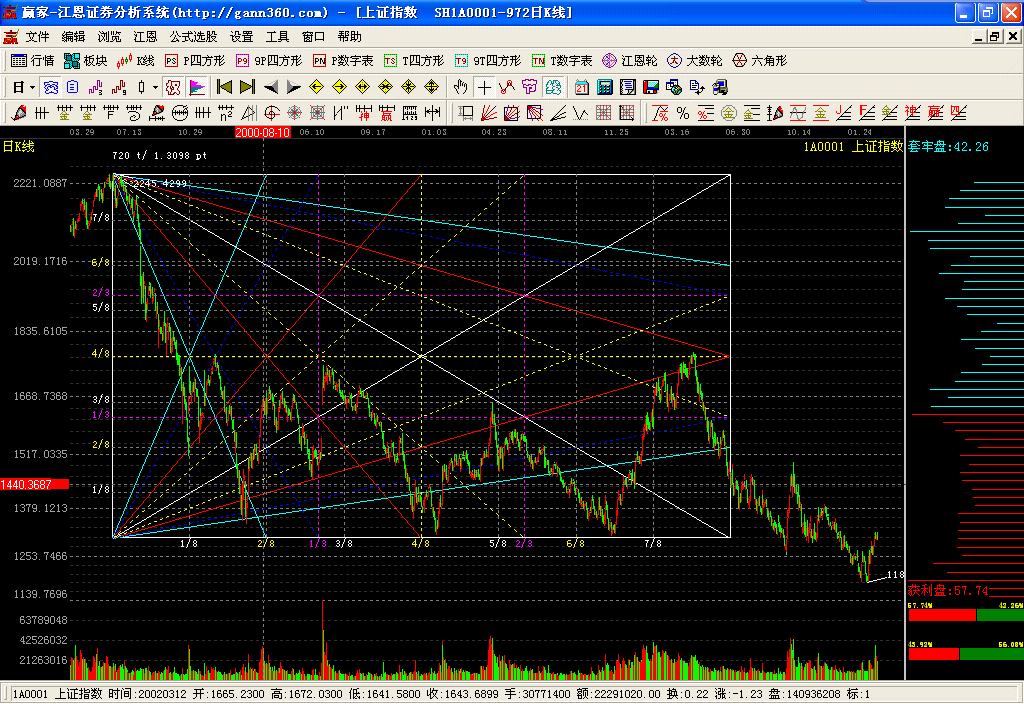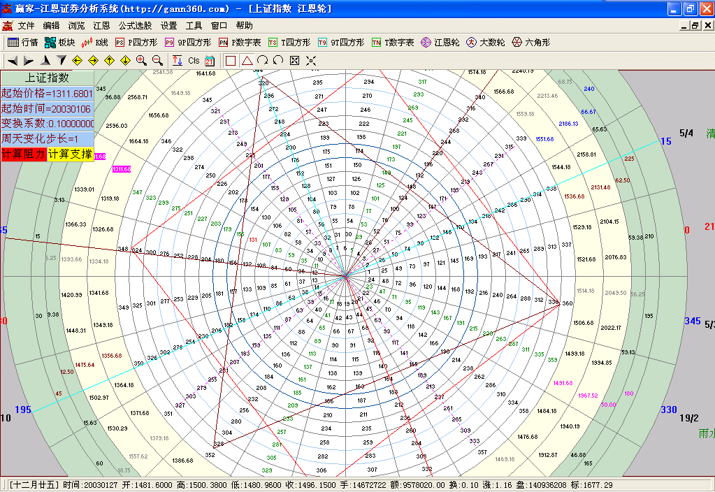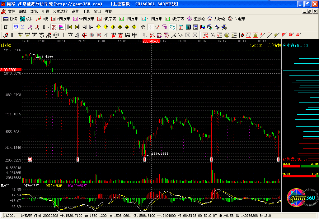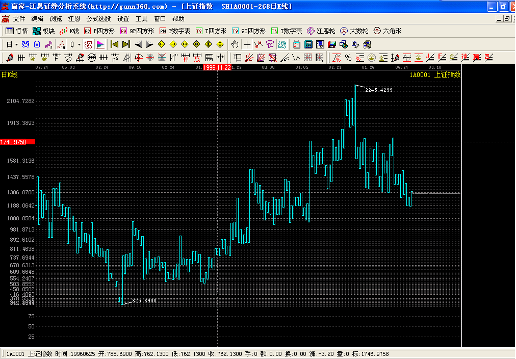 本軟件除實(shí)現(xiàn)了江恩的經(jīng)典判市工具:包括江恩輪、價(jià)格正方形、九格價(jià)格正方形、時(shí)間正方形、九格時(shí)間正方形、六角形、角度線、江恩計(jì)算器、時(shí)間及價(jià)格循環(huán)線、時(shí)間周期線、江恩價(jià)格回調(diào)帶外,增加了百分比線、百分比延伸線、黃金延伸線、黃金回調(diào)帶、黃金分割阻力支撐線、k線價(jià)格四方形、自定義時(shí)間價(jià)格計(jì)算器、黃金時(shí)間周期線、螺旋時(shí)間周期線、自定義周天江恩時(shí)間循環(huán)線、平方時(shí)間循環(huán)線、三點(diǎn)周期線、螺旋歷法時(shí)間循環(huán)線、k線時(shí)間論中論(變盤點(diǎn))、k線時(shí)間四方形(變盤點(diǎn))、時(shí)間轉(zhuǎn)折日提示、24節(jié)氣轉(zhuǎn)折日提示、神奇周期線、神奇價(jià)格線、贏家周期線、自定義時(shí)間周期線、趨勢(shì)轉(zhuǎn)折線、點(diǎn)位跟蹤轉(zhuǎn)折線。