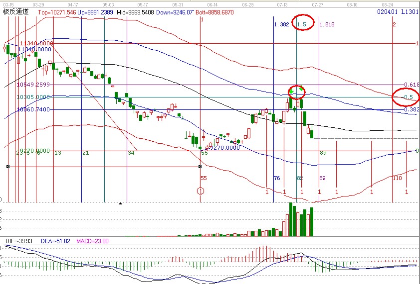 得出以下結論L期貨在2012年3月15日見高點11340至2012年6月8日間低點9270【55】個交易時間下跌了2070點。那么他的未來2分為價格在哪里呢???時間在哪里呢??