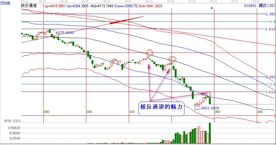 螺紋從3652點紅色下軌的位置,超跌反彈后上漲至極反通道藍色外軌道線的位置,受阻,進日低開后一路走低,收出了一根大陰線,再次體應驗 了應急極反通道的神奇之處【跟上次提到的點位誤差之差6個點,分析3776空單,最高在3782點】