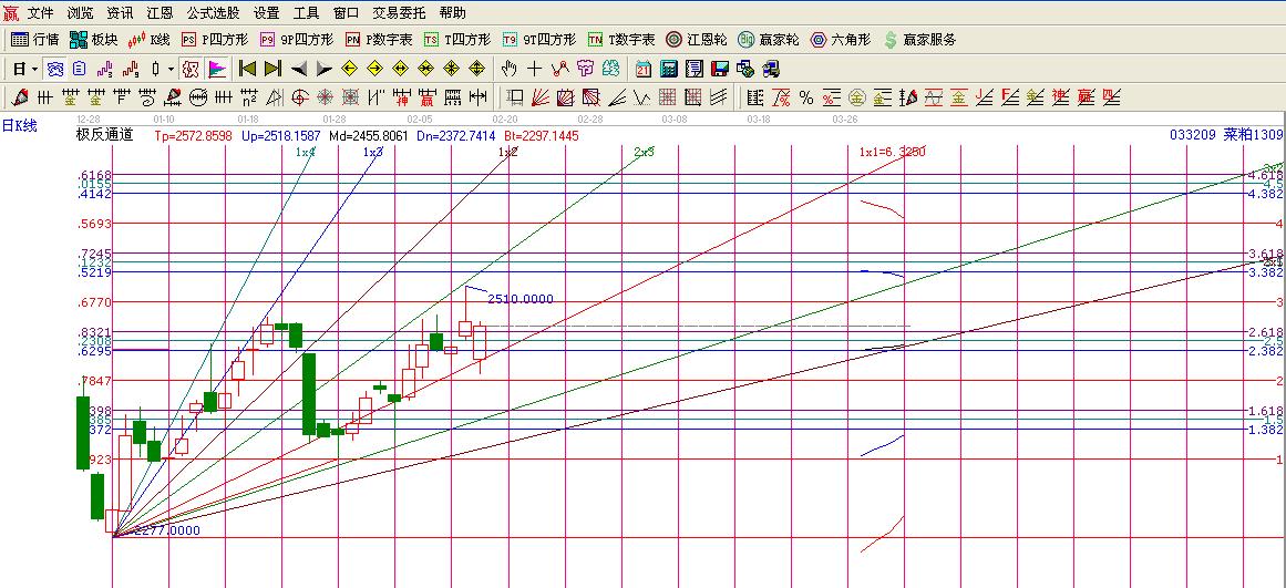 菜粕1309合約一直沿著角度線1*1線的位置穩(wěn)步上行未來也就是20130220日就是重要的時(shí)間拐點(diǎn)的位置,時(shí)間來臨前逢低做多為主。
