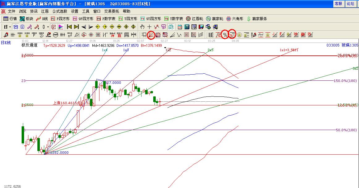 玻璃1282.00波動(dòng)率為3.5611作圖角度線;1282低點(diǎn)作圖江恩價(jià)格百分比,然后在1282點(diǎn)的基礎(chǔ)45度位置做波段應(yīng)用波段百分比延伸線制圖: