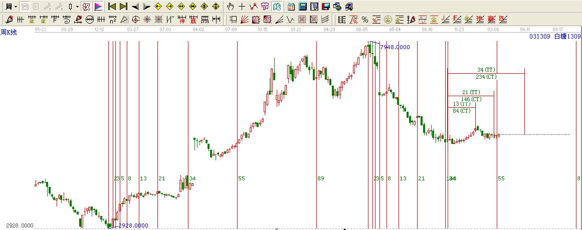 白糖1309合約7978下跌至5150以來后經(jīng)行了為期55周的下跌。55是斐波那契數(shù)列中的一個(gè)數(shù)字,而在其2012-09-28低點(diǎn)5150是其33周的下跌,僅僅誤差了1周。如果以2012-09-28低點(diǎn)5150為起點(diǎn),那么高點(diǎn)在其2013-03-11周提前一周,然后開啟了一個(gè)調(diào)整。目前也走過了21時(shí)間窗口。下一個(gè)時(shí)間窗口在其34時(shí)間周期。2702如果用心去研究你會(huì)發(fā)現(xiàn)更為奇異的事情,白糖1309合約周線2008-12-13日低點(diǎn)2928點(diǎn)到期7948高點(diǎn)來調(diào)整的時(shí)間144周剛好坐落于周2012-09-28低點(diǎn)5150白糖1309合約周線時(shí)間窗口變盤在即,日線級別也非常的巧妙:白糖1309至2012-09-26日低點(diǎn)2150以來,每一次的低點(diǎn)都在不斷的抬高上方在其5480構(gòu)成了較為重要的壓力位置。