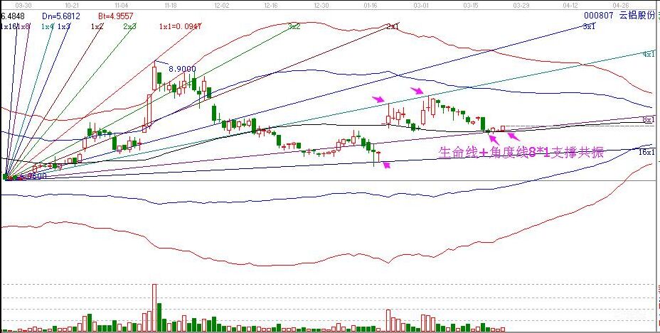 上面就是運(yùn)用我們的軟件所做的一個(gè)分析圖,近期的云鋁股份的走勢(shì)中,我們可以看到股價(jià)每次的高點(diǎn)低點(diǎn)都落在每條角度線位置線上,而且此時(shí)該股正是出在8*1線的支撐,同時(shí)它還處于極反通道的生命線支撐之上,二者形成了共振,所以大家可以對(duì)這只股進(jìn)行關(guān)注。顯然上面運(yùn)用到的指標(biāo)就是江恩角度線和極反通道。