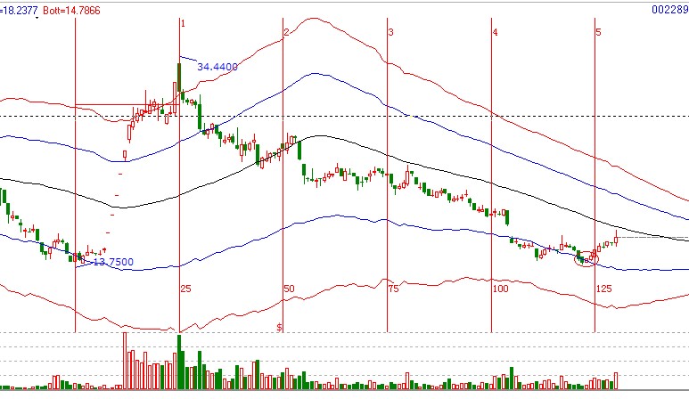 【002289】2012年1月17號至2012年3月7號25個(gè)交易日漲幅達(dá)150%,使用贏家江恩時(shí)間工具黃金分割周期圖做圖,結(jié)果如圖2012年8月3號是第5個(gè)循環(huán)的結(jié)束點(diǎn),同時(shí)價(jià)格在極反通道弱勢外軌線位置,時(shí)間價(jià)格達(dá)成共振及為操作點(diǎn);