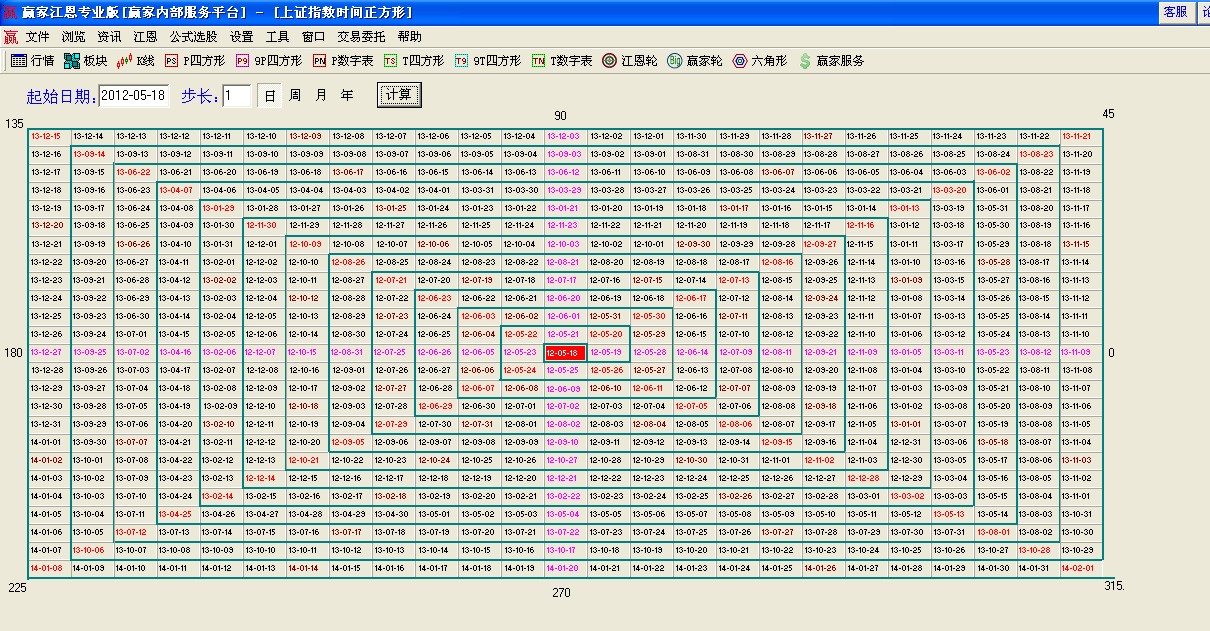 江恩四方形在贏家江恩軟件上使用方法已做過講解大家可百度查詢學(xué)習(xí),今天我們講下手動做時間四方形,首先準(zhǔn)備一張白紙,用1*1的比例畫出四方格子,橫堅為25格,圖形做好后中心格子為我們選擇的分析時間周期的起點,然后計算好步長(波動率),逐步逆時針展開可以繪圖了;
