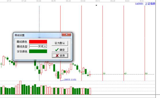 ? 畫(huà)線設(shè)置。系統(tǒng)默認(rèn)的為紅色、實(shí)線、綠色字符。大家可以根據(jù)自己的喜好進(jìn)行設(shè)置。將鼠標(biāo)移動(dòng)到所選的起點(diǎn)處,鼠標(biāo)變成十字狀,點(diǎn)擊鼠標(biāo)右鍵——編輯等距時(shí)間周期線,出現(xiàn)如下圖,進(jìn)行設(shè)置即可。常用的設(shè)為默認(rèn)。