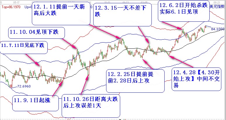 2011年9月1日美元指數(shù)在四方形時(shí)間315度位置止跌上攻一路上攻到2011年10月10日.2011年10月4日也是時(shí)間四方形重要轉(zhuǎn)折點(diǎn),然后一路暴跌至2.11年10月27日,時(shí)間四方形在11年10月26日提起一天發(fā)出信號(hào),然后一路上揚(yáng),隨后的重要轉(zhuǎn)折點(diǎn)例如:12年1月1日;12年2月25日;12年3月15日;12年4月28日;12年6月2日。
